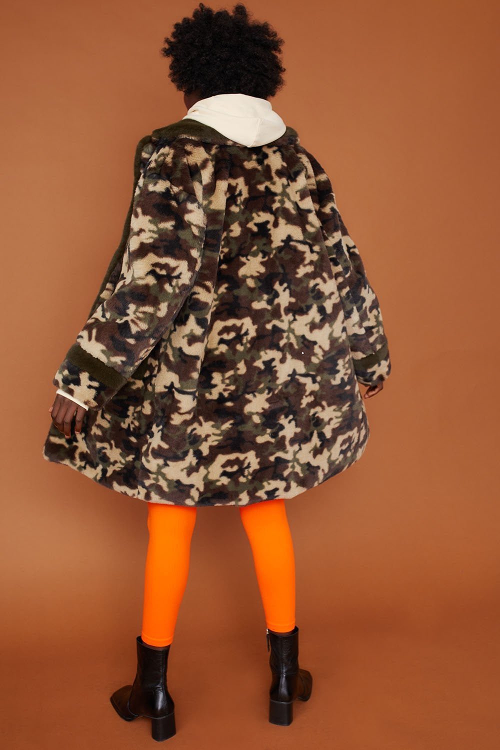 The camouflage pattern adds visual interest and modern edge, while the sheepskin construction retains classic winter function. The outer hide resists wind and wear, while the inner wool-side keeps you naturally warm and comfortable. With its versatile design, the Camo Sheepskin Coat pairs with denim and boots for a casual look, or with darker trousers and a sweater for a refined edge.