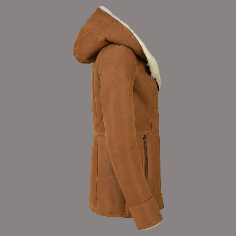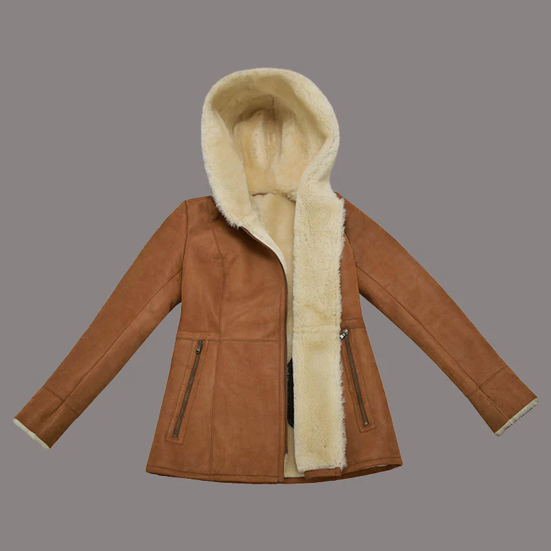Stylish womens sheepskin coa | with hood offering warmth, comfort, and versatile wear for any occasion.