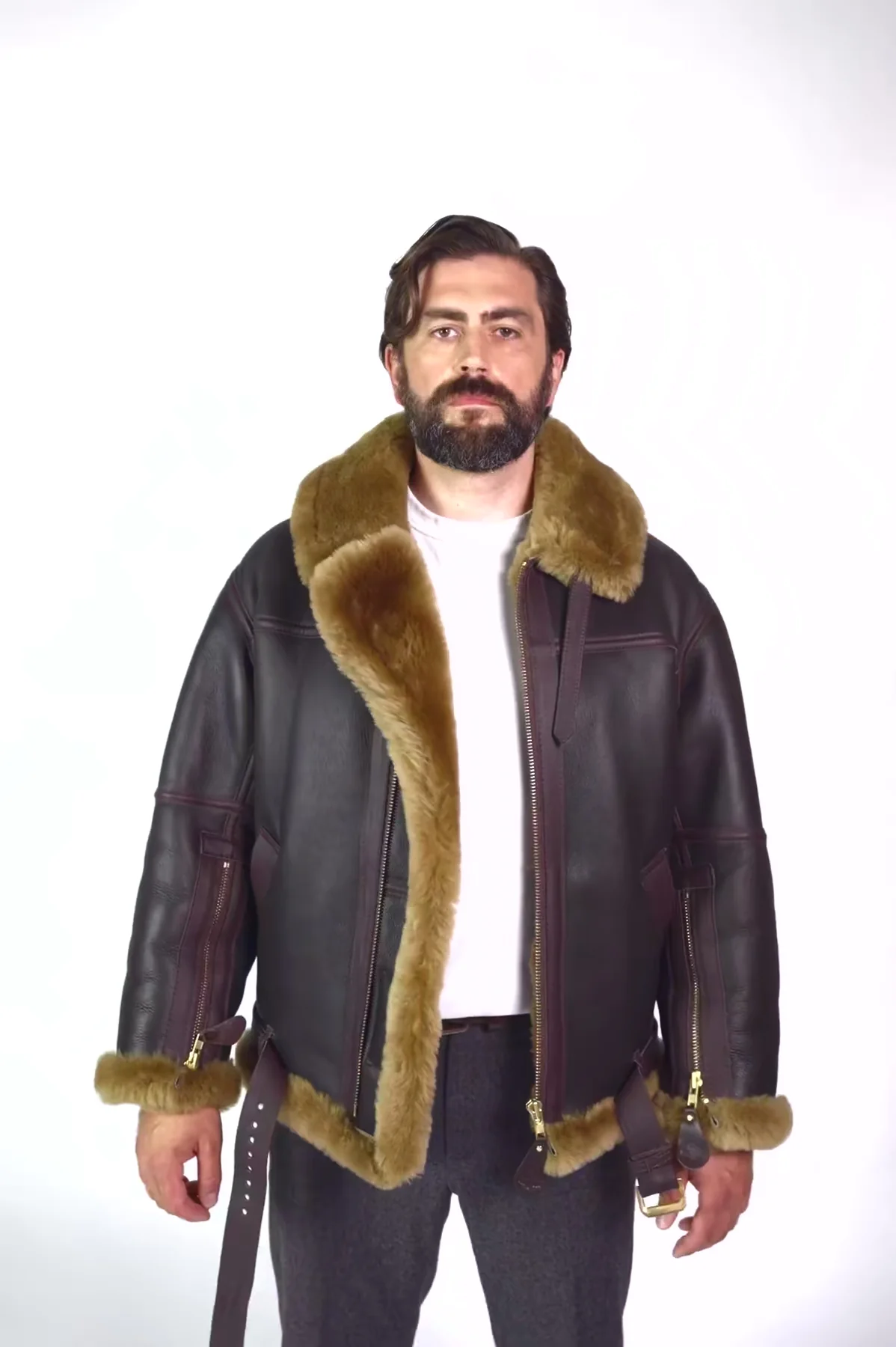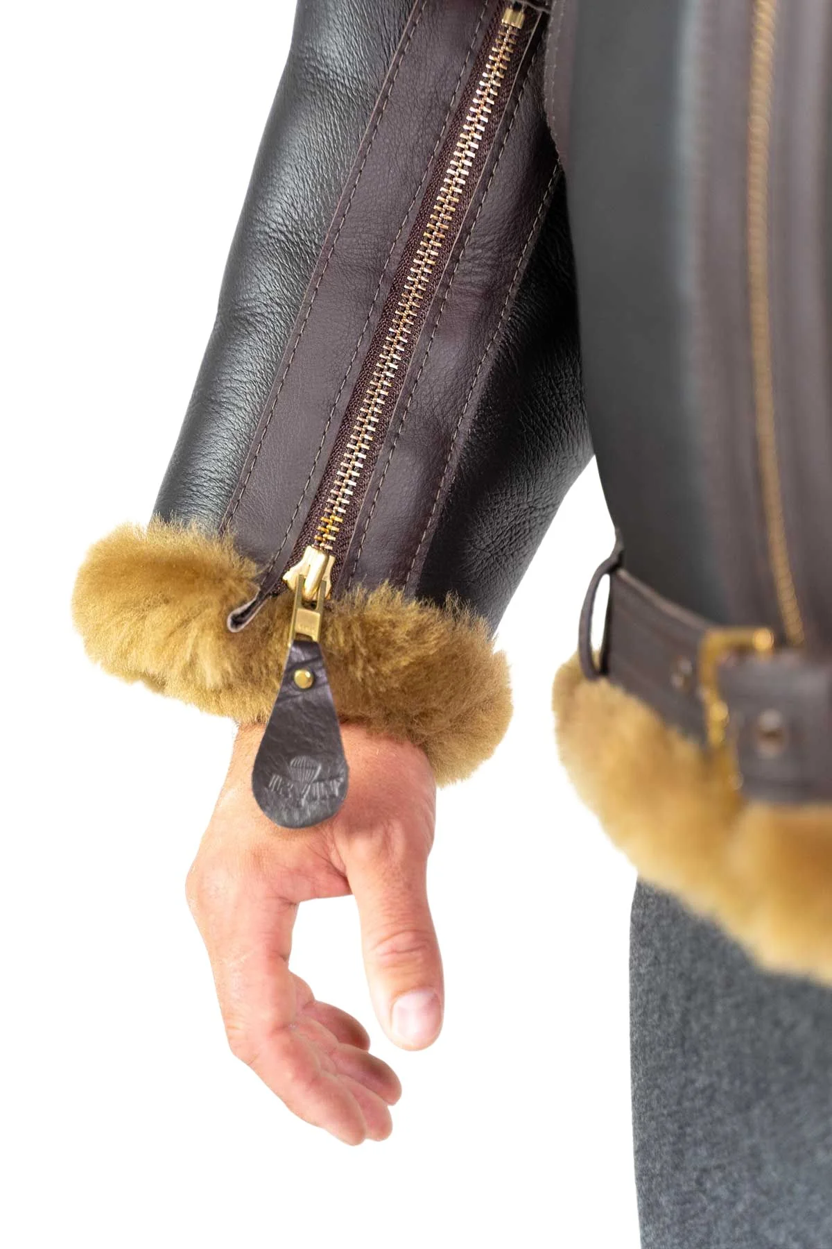 Crafted from premium genuine sheepskin, the jacket features a soft shearling lining that keeps the wearer insulated in cold conditions. The classic leather exterior offers durability and a distinctive vintage look, while reinforced stitching ensures the jacket withstands years of use. Its design includes the traditional front zip, buckle strap collar, and rib-knit cuffs that replicate the original WW2 functionality while adapting to modern fit and comfort.